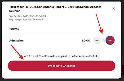 3. Use the + and - to adjust your ticket quantity. The click on Proceed to Checkout.