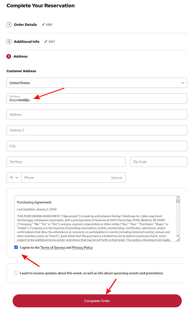7. On the Complete your Reservation screen, enter your name and check the I Agree box. The other information is optional. Click on Complete Order.